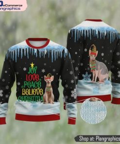 Cat Christmas Sweater, Sphynx Cat Joy Love Peace Believe Ugly Christmas Sweater