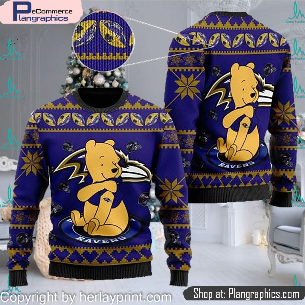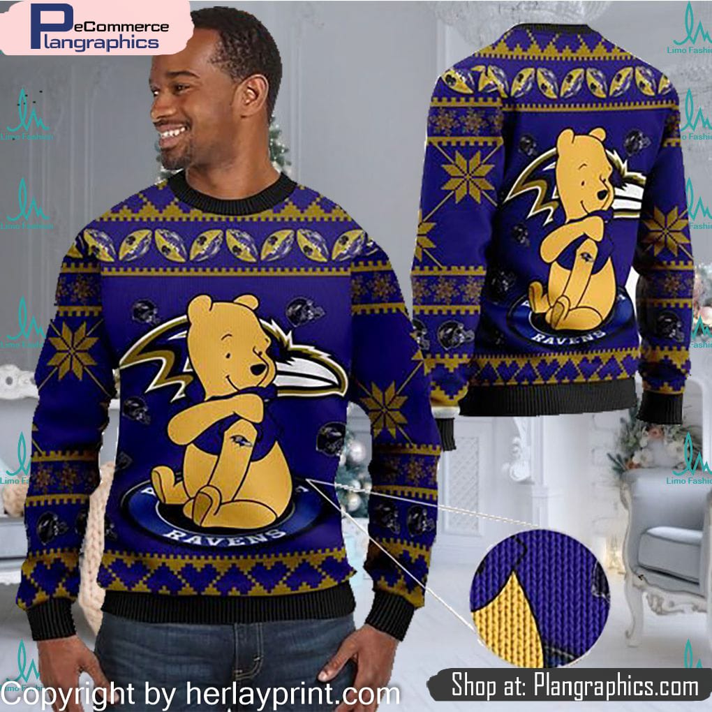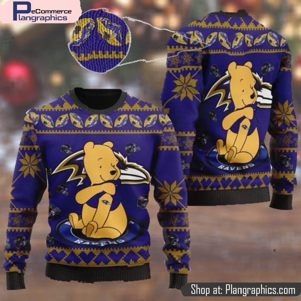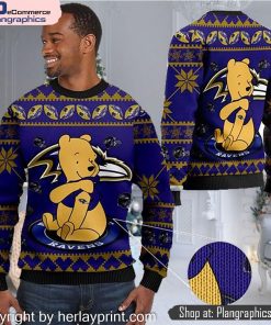 Baltimore Ravens NFL American Football Team Logo Cute Winnie The Pooh Bear 3D Ugly Christmas Sweater