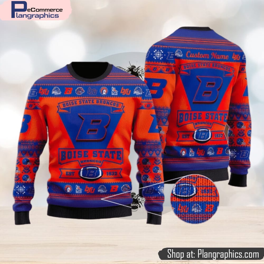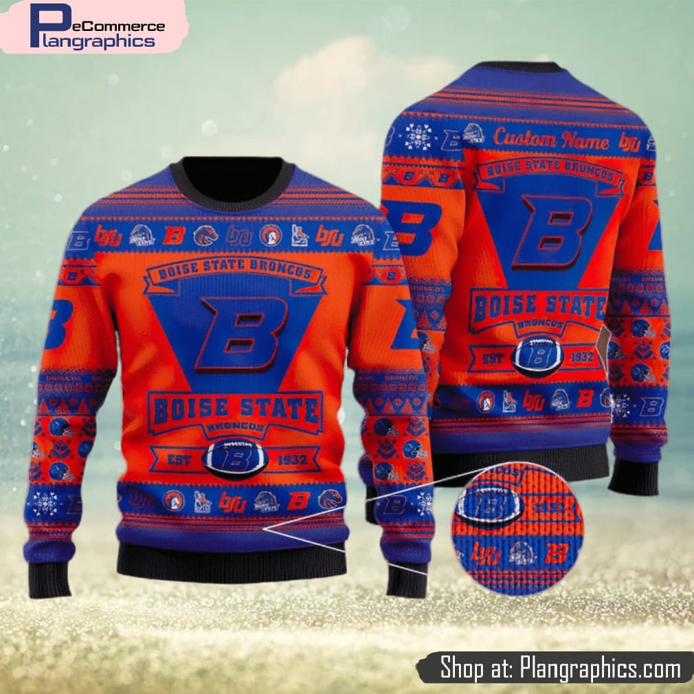 The Boise State Broncos Football Team Logo Custom Christmas Gift All Over Print Ugly Christmas Sweater is the perfect gift for the biggest fan. Boasting the team logo and colors, this sweater is made from comfortable and durable material and is sure to last through years of holiday parties. The soft and cozy material will keep them warm all winter long and the all-over print allows for a full range of movement. Whether they’re headed to a Broncos game or an ugly christmas sweater party, this sweater is the perfect way to show support for the team. With its vivid colors and festive design, it’s sure to bring cheer to any holiday gathering.