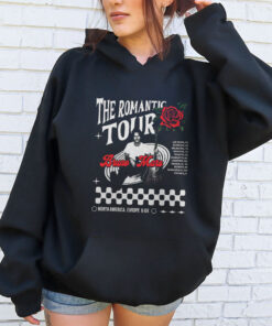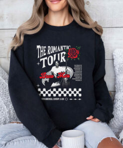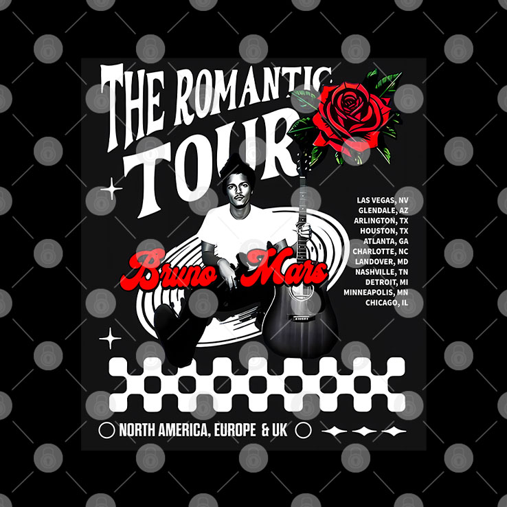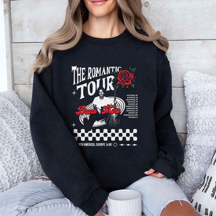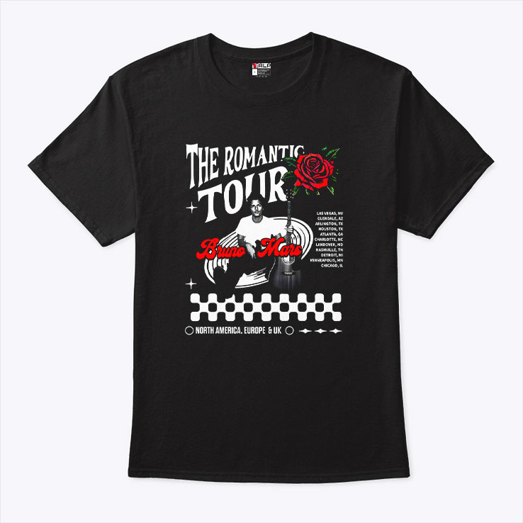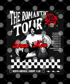 The shirt bursts with a bold retro rock concert energy, instantly grabbing attention with its rich tapestry of design elements. A cascade of roses winds around a sleek guitar, weaving through large serif typography that boldly declares the spirit of the tour. Checkerboard patterns edge the scene, lending a dynamic, almost rebellious rhythm to the print, while star accents shimmer like flashes of stage lights. The mix of display serif fonts layered with script insets gives the entire graphic a tactile, almost vintage poster feel, capturing the excitement and passion of live music nights. This design is not just about aesthetics—it’s a statement. It’s for those who live and breathe music, the kind of fans who connect deeply with Bruno Mars’ blend of soulful melodies and vibrant showmanship. Wearing this shirt signals a pride in that connection, a way to channel the upbeat intensity of concert outings or festival weekends. It’s a nod to the electrifying energy of performing artists and the community built around shared love for music’s magic. Pair it with dark denim or leather jackets to echo the boldness, or keep it casual with shorts and sneakers for effortless festival-ready vibes. Those who are unapologetically themselves, who appreciate a powerful blast of retro flair balanced with modern edge, will wear this confidently. Whether it’s a gift for the die-hard Bruno Mars fan or a personal addition to a music lover’s wardrobe, the Bruno Mars Romantic Tour shirt fits seamlessly into a lifestyle driven by rhythm, soul, and vibrant memories.