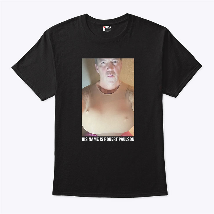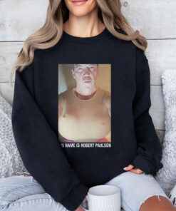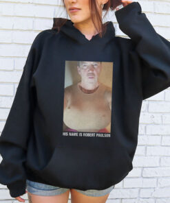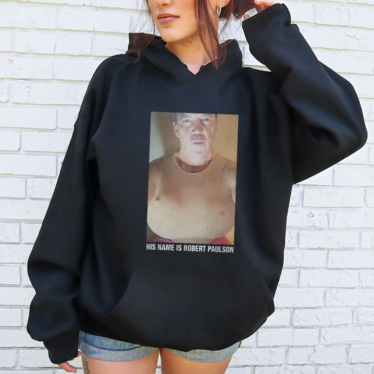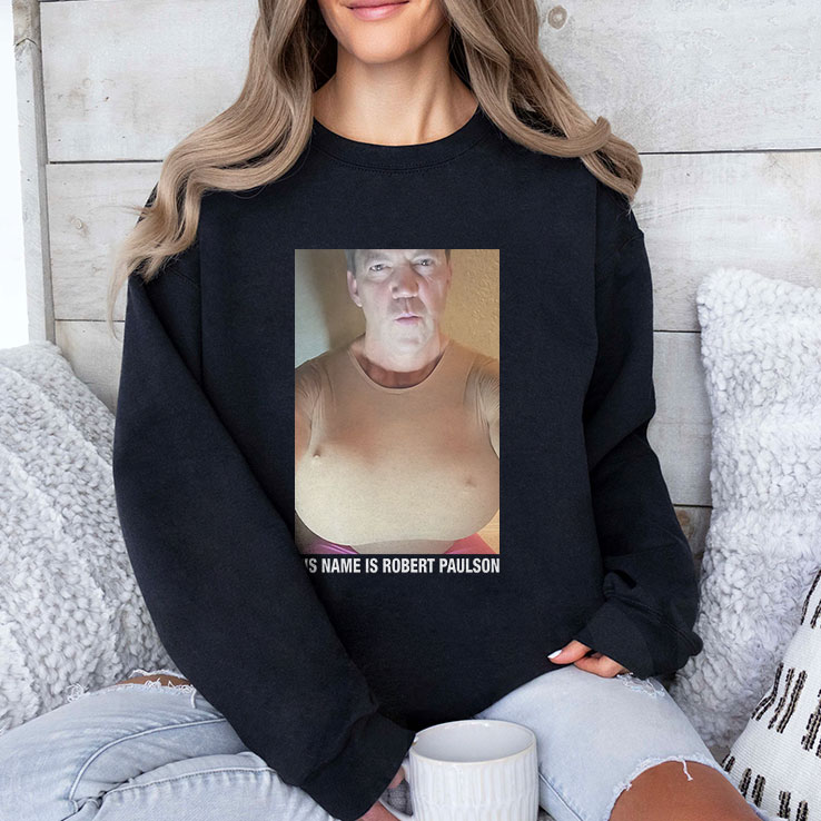 A stark black-and-white image of a man stares out from the chest, his expression caught in a moment of quiet intensity. Beneath him, bold uppercase letters claim the phrase HIS NAME IS ROBERT PAULSON with an unapologetic punch, the typography sharp and unyielding, laid out in a clean, sans-serif font. The contrast between the graphic and the stark text creates a visual tension that’s both humorous and defiant, inviting recognition from those in the know. This shirt doesn’t just announce fandom; it declares a personal connection to a cultural moment that’s part meme, part mantra. It’s for the individual who wears their references loudly but without apology—someone who understands that identity can be shaped in playful rebellion, mixing dark humor with a nod to community. This is a garment for those who find joy in subverting expectations, layering meaning beneath everyday wear. Whether pairing it with worn jeans for a casual weekend or gifting it to a friend who thrives on inside jokes and viral culture, the design holds its ground. It’s less about blending in and more about sparking a knowing smirk across a crowd. Wearing this shirt is a quiet challenge, inviting a story to unfold beyond the fabric, one that celebrates being unmistakably yourself in any room.