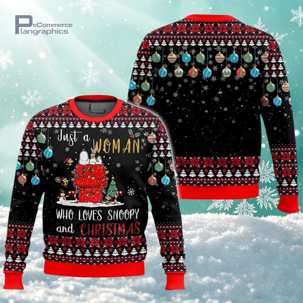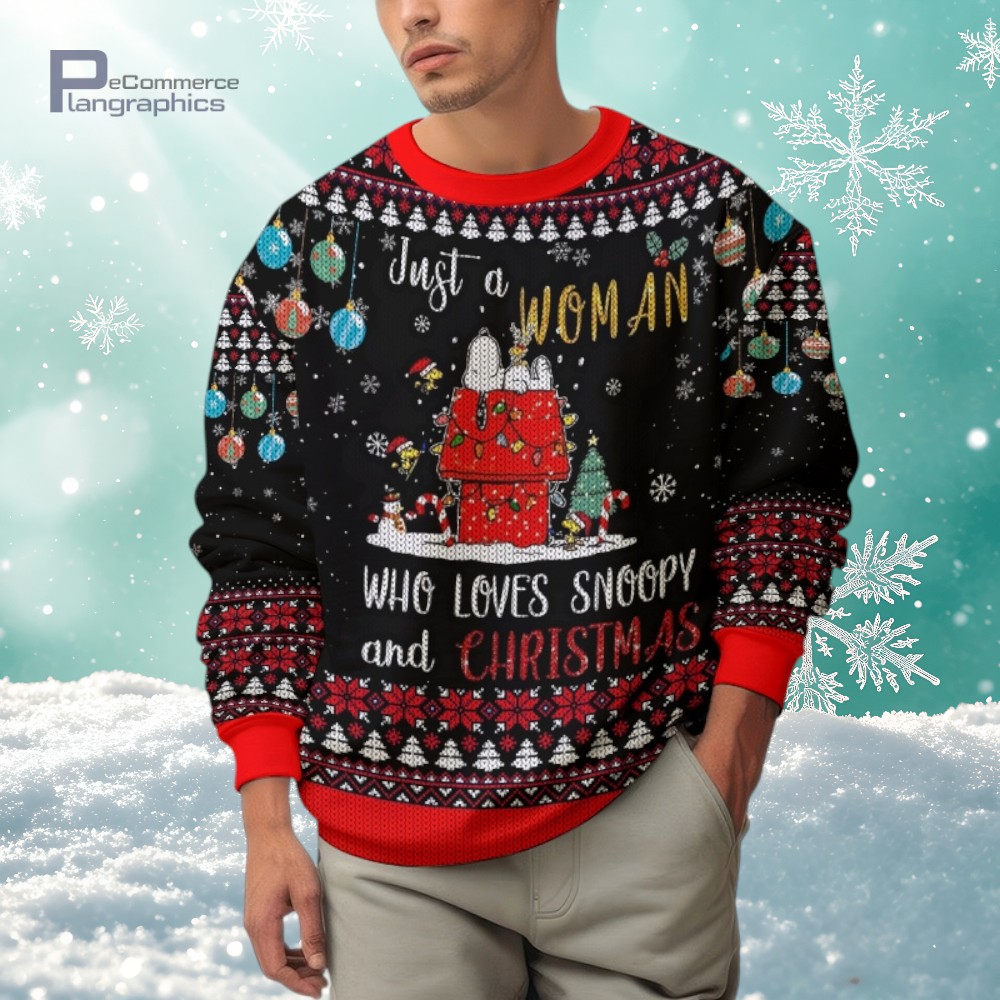 Just A Woman Who Loves Snoopy And Christmas 3D All Over Printed Ugly Christmas Sweater
