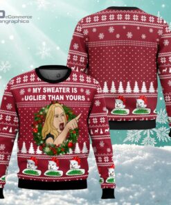 The first thing you notice is the woman right in the center, pointing with a kind of cheeky confidence. Around her, a playful mix of holiday icons—snowflakes drift gently past cartoon reindeer and polar bears, all framed by a bright green wreath that adds a burst of festive color. The whole scene is loud and unapologetic, wrapped in bold uppercase letters that seem to shout the sweater’s message from across the room. It’s the kind of design that doesn’t just settle for being an ugly Christmas sweater—it leans into the humor and the meme culture with a wink. This sweater balances that classic holiday chaos with a sharp graphic style that meme lovers will appreciate, especially anyone who loves showcasing a bit of sarcasm alongside seasonal cheer. Picture wearing it to an ugly sweater party where the goal is to stand out, not blend in. It pairs well with simple jeans or leggings, letting the vibrant print take center stage without feeling overwhelming. Women who enjoy this sweater tend to have a playful side and don’t mind drawing attention. It’s a confident choice—perfect for anyone who’s not afraid to poke fun at holiday traditions or who wants to gift a laugh to a close friend. Whether it’s for a casual night with friends or a quirky holiday gathering, the My Sweater Is Uglier Than Yours Woman x Cat Meme 3D All Over Printed Ugly Christmas Sweater fits right in.