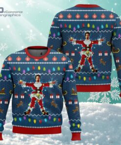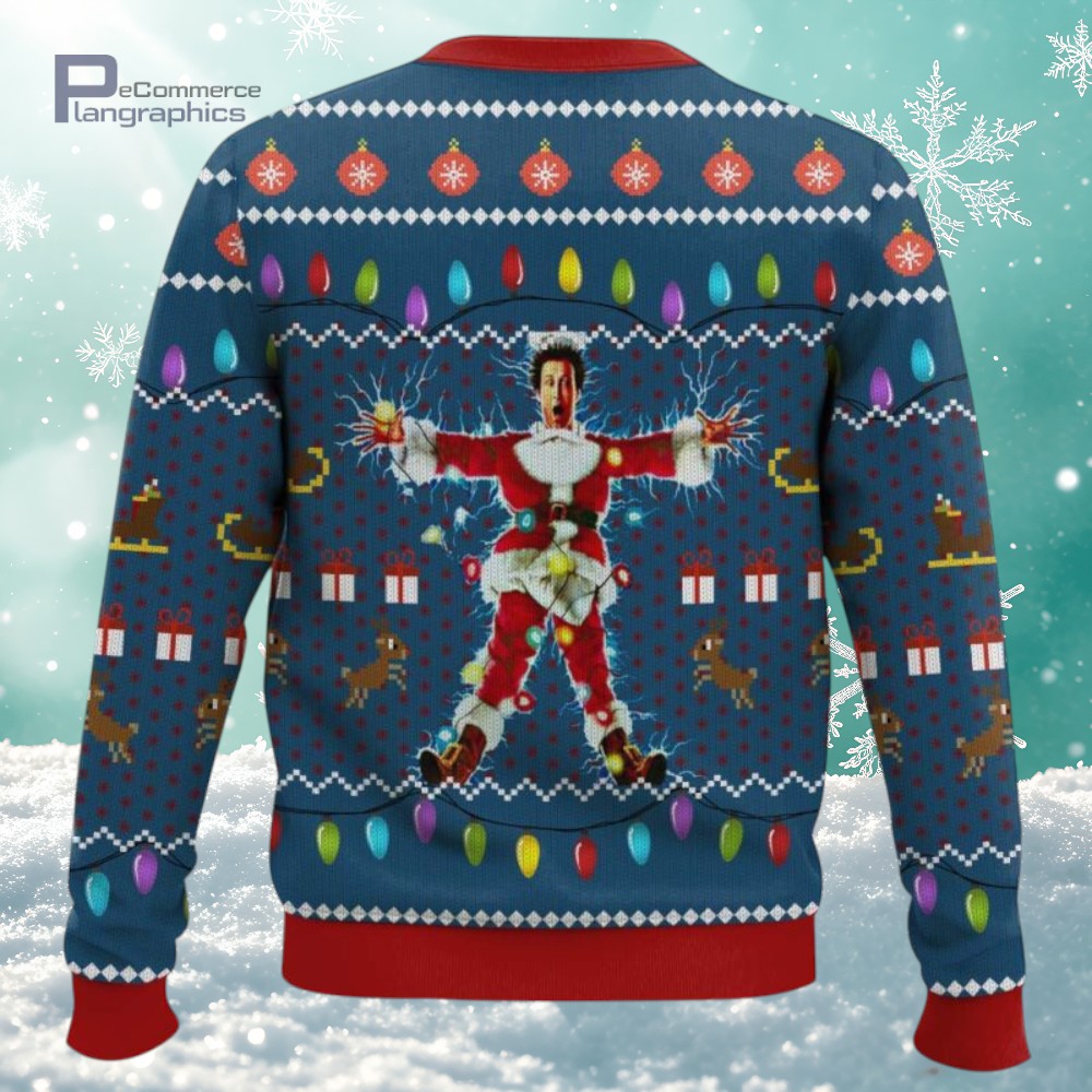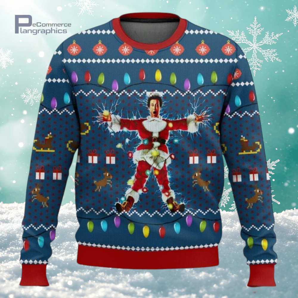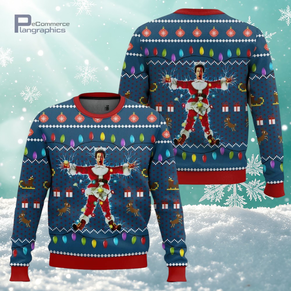 A vivid splash of blue sets the stage for a holiday statement that’s anything but subtle. At its center, a jubilant figure dances with abandon, framed by a tangle of brightly colored Christmas lights that zigzag across the knit, spilling around wrapped gifts and mischievous reindeer caught mid-leap. Red accents flicker through the festive patterns, adding a punchy contrast that elevates the cheerfully chaotic scene. The design feels alive—like a scene caught between a holiday party’s wildest moments and the familiar humor of a classic comedy. This National Lampoon ugly Christmas sweater doesn’t just drape over the wearer; it broadcasts a mindset. It’s for someone who embraces the ridiculous, who revels in nostalgia mixed with a sharp comedic edge. It’s the kind of piece that sparks conversations and laughter, a wearable nod to those who delight in parody and the over-the-top spirit of the season. Pair it casually with jeans or relaxed trousers, letting the sweater’s playfulness take center stage. Those who pick it will likely cherish spontaneous gatherings, quirky traditions, or the thrill of standing out in a crowd of predictable holiday attire. It’s less about blending in and more about celebrating individuality in full, unapologetic color. Whether worn to an ugly sweater party or gifted to a friend who lives for campy humor, it carries a lively energy that’s impossible to ignore.