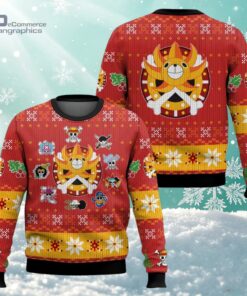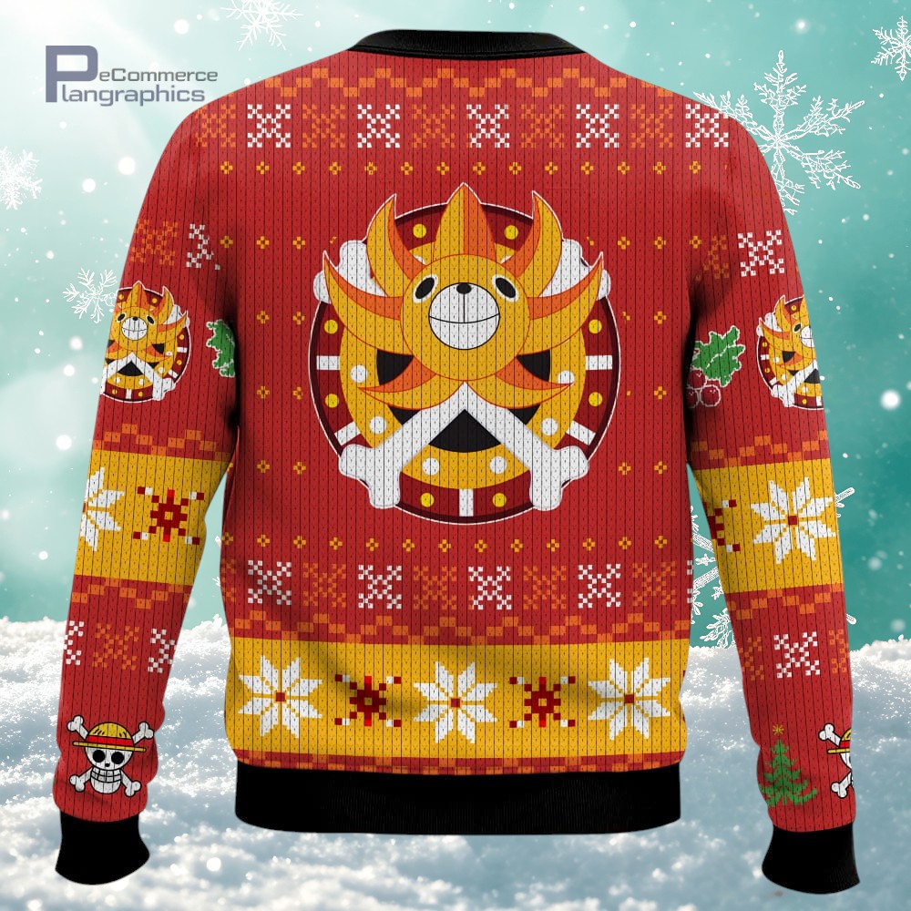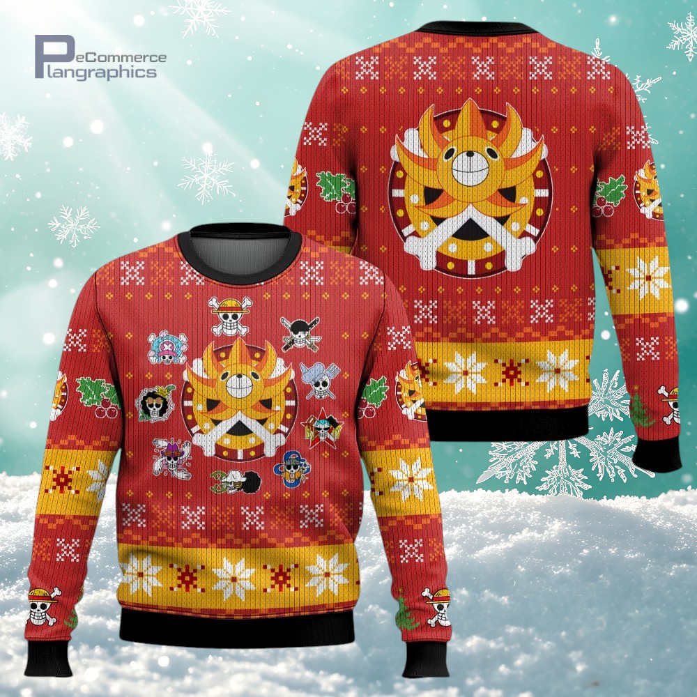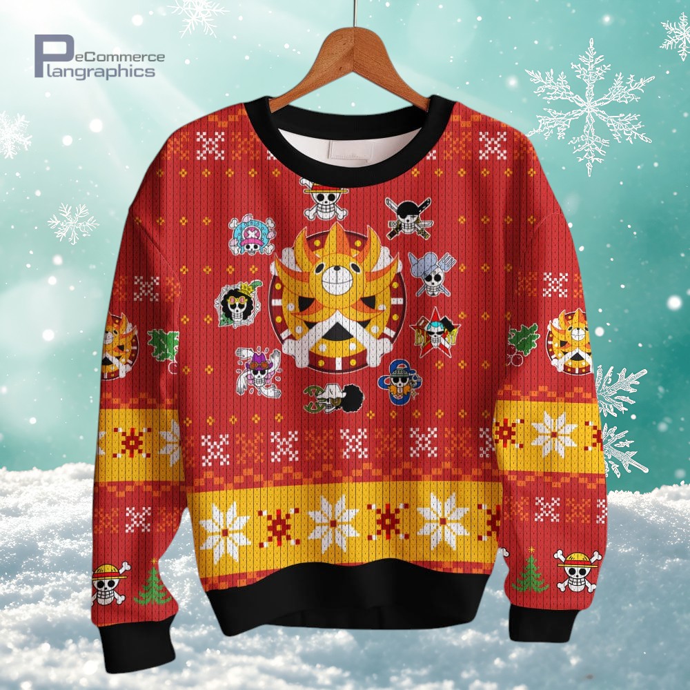 if you’re into One Piece and you like celebrating the holidays with something a bit quirky, this Thousand Sunny ugly Christmas sweater is a total win. It’s got that classic holiday vibe with red knit and yellow bands, but what really makes it stand out is the bold design featuring skull motifs and character icons from the show. Plus, there are snowflakes and festive patterns mixed in, which really add this playful, celebratory feel without going overboard. What I love is how the central mascot, the Thousand Sunny ship, is right there in the middle, making it clear this isn’t just any holiday sweater—it’s a nod to all of us anime fans who want something fun to wear during the season. It’s perfect if you’ve got friends or family who are deep into One Piece, or if you just want to show off your fandom in a way that’s spirited but not too serious. This sweater fits right in at ugly Christmas parties or casual holiday hangouts, especially if you’re tired of the usual reindeer and Santa patterns. Honestly, it’s a neat way to feel festive and still stay connected to a favorite series. Whether you’re gifting it to a fellow anime lover or grabbing one for yourself, it’s a fun piece to bring some extra personality to the holiday wardrobe.