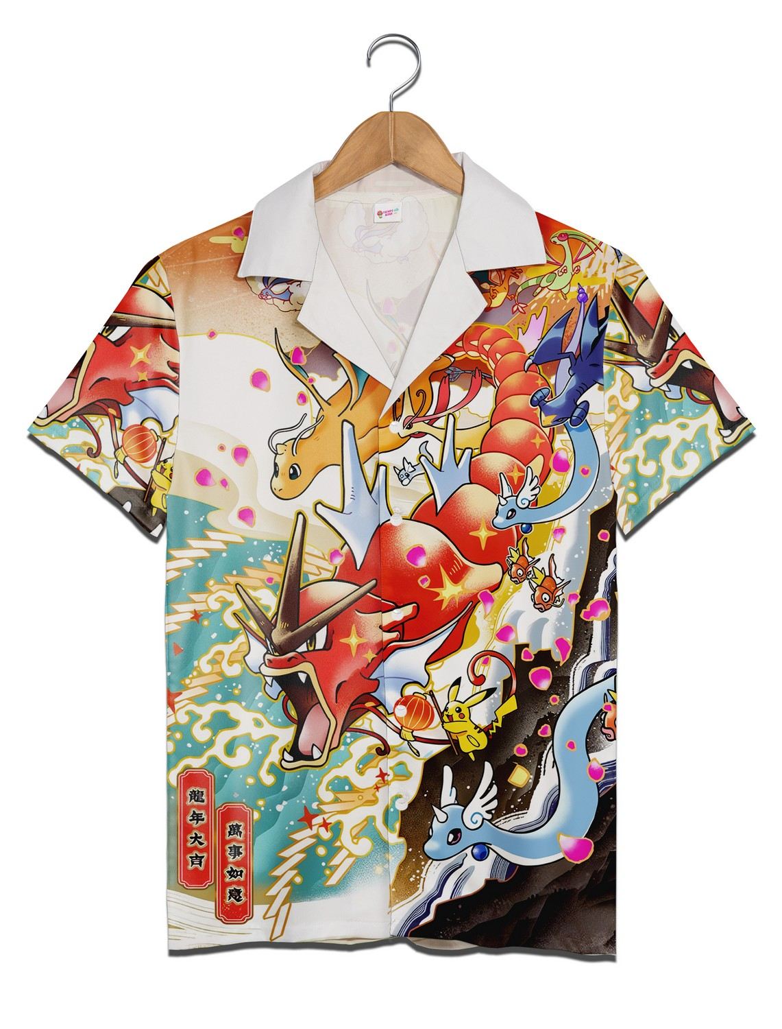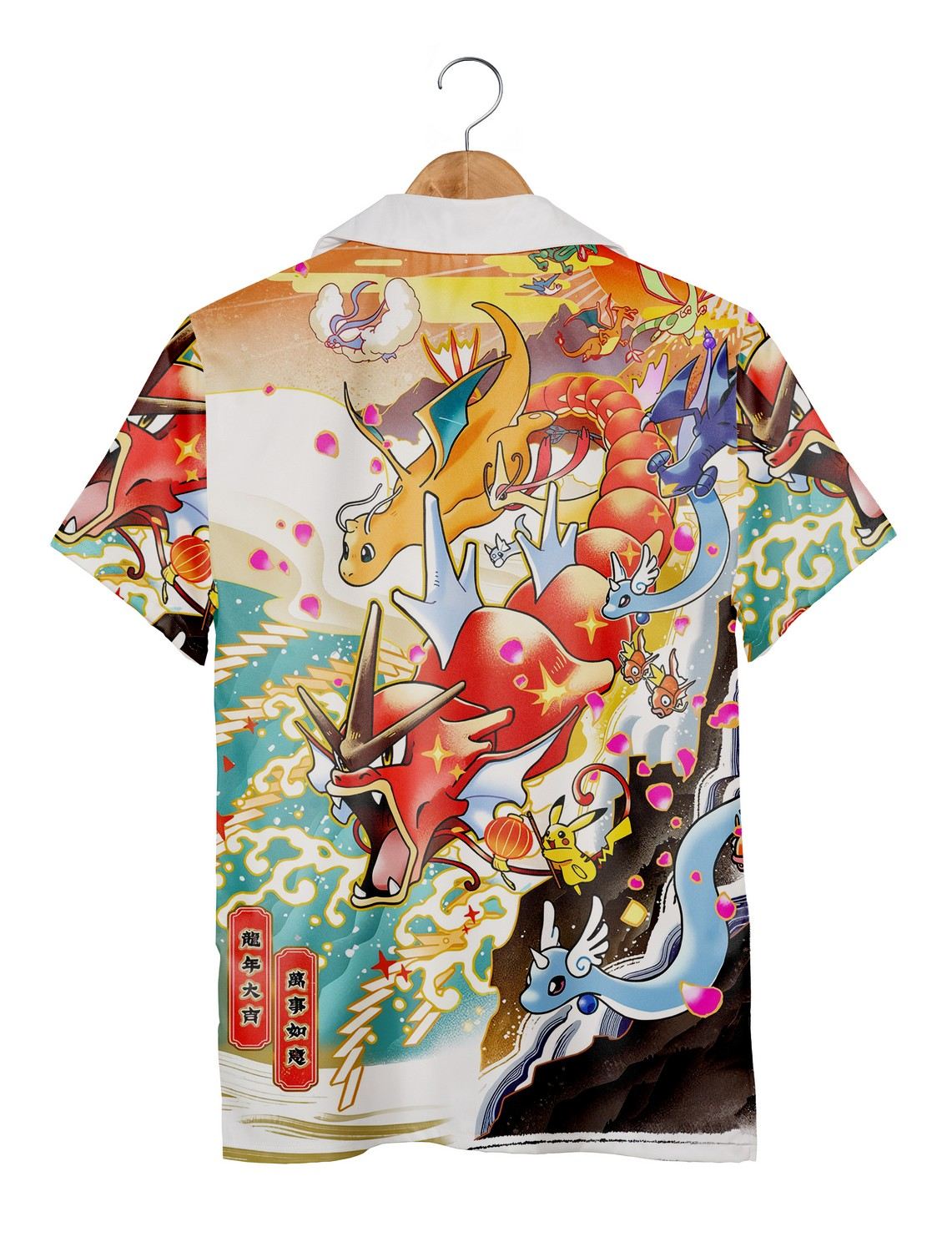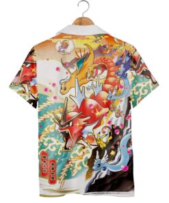 The shirt bursts with energy, its surface alive with waves curling under the vibrant forms of Gyarados, Pikachu, and Dragonair. Bright blues and fiery reds blend with soft pastels of cherry blossoms, peppered alongside dynamic fireworks that seem to ignite the fabric itself. The design strikes a playful balance—bold enough to catch the eye, yet detailed with enough care to reward closer looks. It’s a vivid homage to Pokémon that doesn’t feel childish but carries a retro souvenir charm, perfectly tuned for summer’s laid-back mood. Looking closer, each character is rendered with lively brushstrokes that suggest movement, as if they might swim or flutter right off the fabric. The waves roll across the shirt in sweeping arcs, grounding the chaos of color with natural rhythm. It’s a compelling visual story drawn from one’s nostalgia and love for anime culture, making it more personal than a typical graphic tee. This shirt fits effortlessly with casual shorts or worn open over a simple tank, a statement piece that turns a routine day into something a bit more special. It’s for the fan who embraces their passion outwardly—someone who enjoys summer festivals, beach trips, or simply sharing a subtle nod among fellow enthusiasts. Whether as a thoughtful gift or a bold addition to a personal collection, this Pokémon Hawaiian shirt carries both playful spirit and summer warmth.