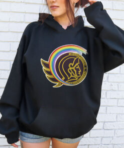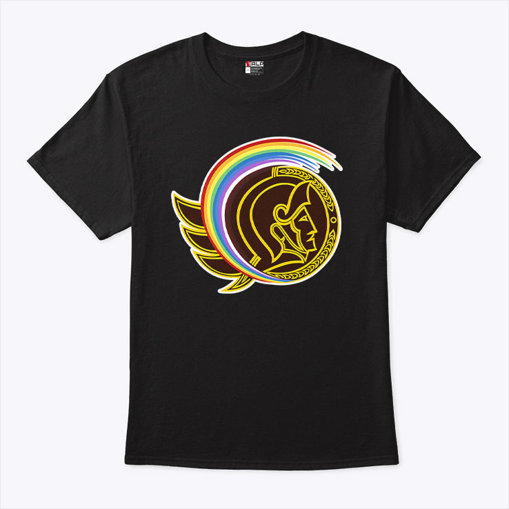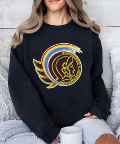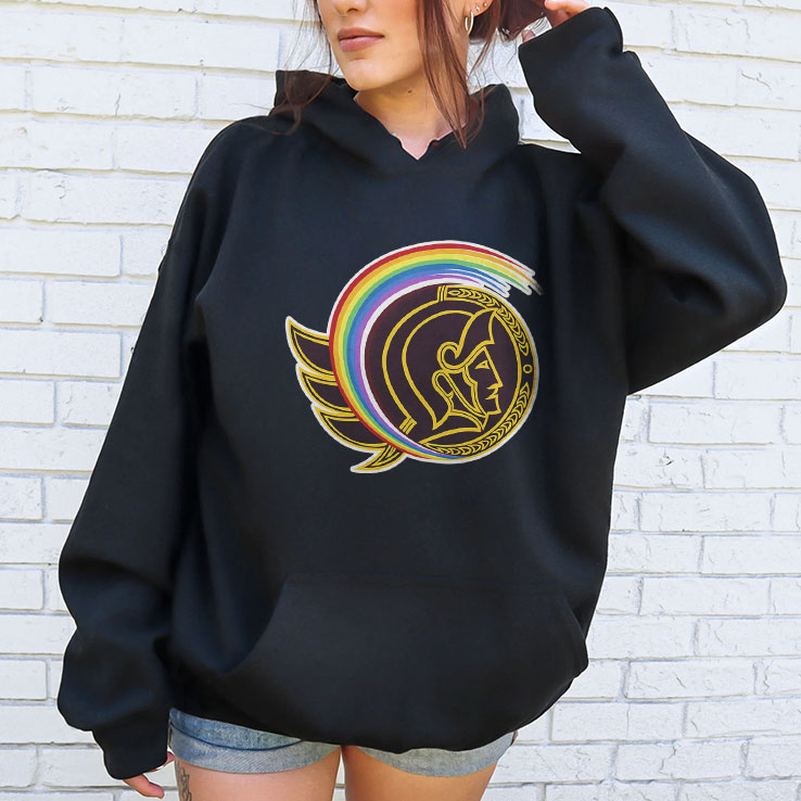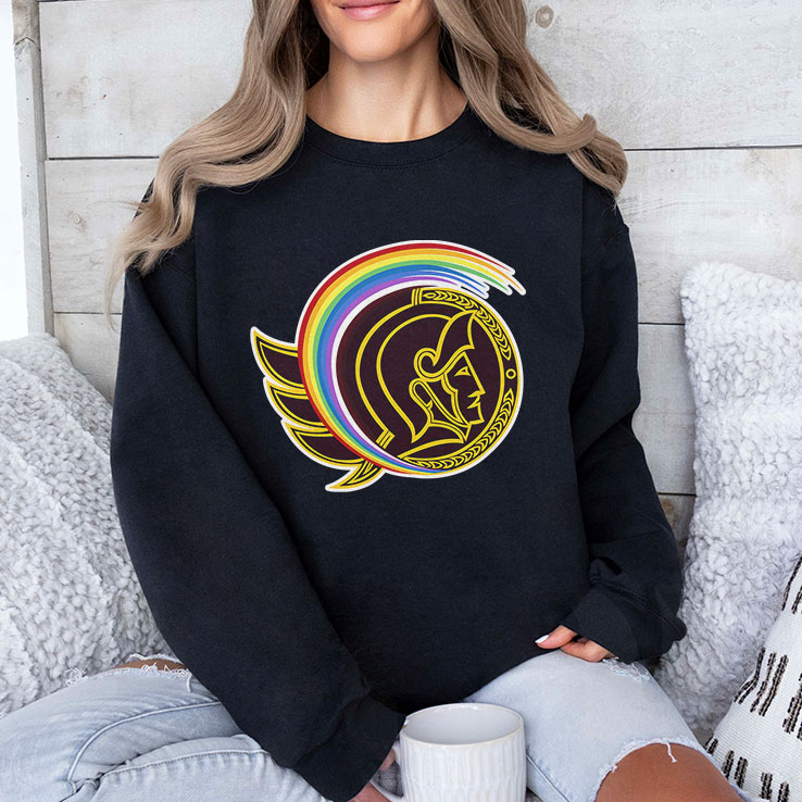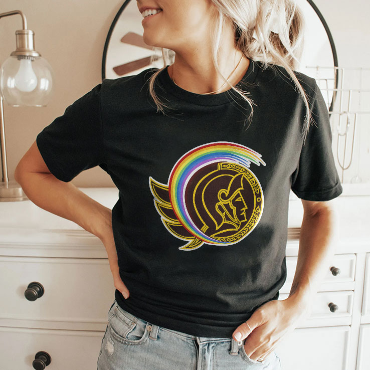 The sharp lines of the Ottawa Senators crest take center stage against the deep black fabric, commanding attention with their bold intensity. A stylized horse head, fierce and poised, anchors the circular motif, its form reminiscent of classic hockey iconography but energized with a modern edge. Arching above this emblem, a vibrant rainbow swoosh slices through the design, adding an unexpected burst of color and movement that breathes life into the shirt. The contrast between the dark backdrop and the vivid arc creates a dynamic tension, capturing both strength and individuality. This shirt speaks to more than just allegiance to a team. It invites wearers to celebrate the complexity of their fandom, blending tradition and personal expression in a way that feels authentic. Wearing it isn’t about blending into the crowd; it’s for those who want their passion to be unmistakable, layered with a subtle nod toward inclusion and spectrum of identity within the sports community. Avid hockey supporters who cherish the Senators’ history but aren’t afraid to wear something visually striking will find a genuine connection here. It carries the weight of game-day energy and the casual confidence of everyday wear without feeling overdone. As a gift, it fits naturally into the lifestyle of someone who lives for hockey seasons, post-game conversations, or simply showing off a vibrant twist on a classic emblem. The Ottawa Senators shirt thus becomes more than gear—it’s a statement of personal fandom wrapped in thoughtful design.
