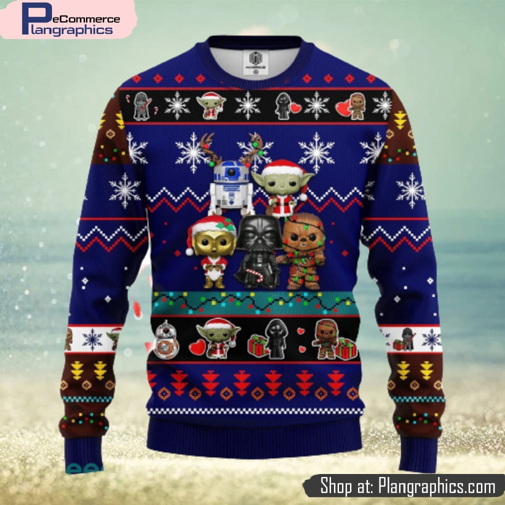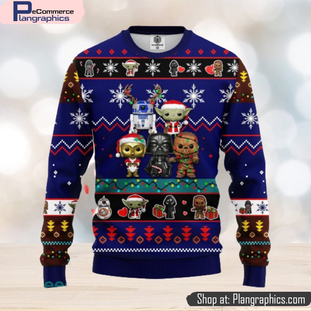 Get ready for the holiday season with this adorable Star Wars-themed ugly Christmas sweater. With its eye-catching blue color and fun design, it is sure to be a hit at any holiday gathering. This sweater is perfect for both men and women and makes an amazing gift for any Star Wars fan. The intricate details and cute characters make it a unique and festive addition to any wardrobe. Whether you’re attending an ugly sweater party or just want to spread some holiday cheer, this Star Wars sweater is the perfect choice. Don’t miss out on this one-of-a-kind Christmas gift!