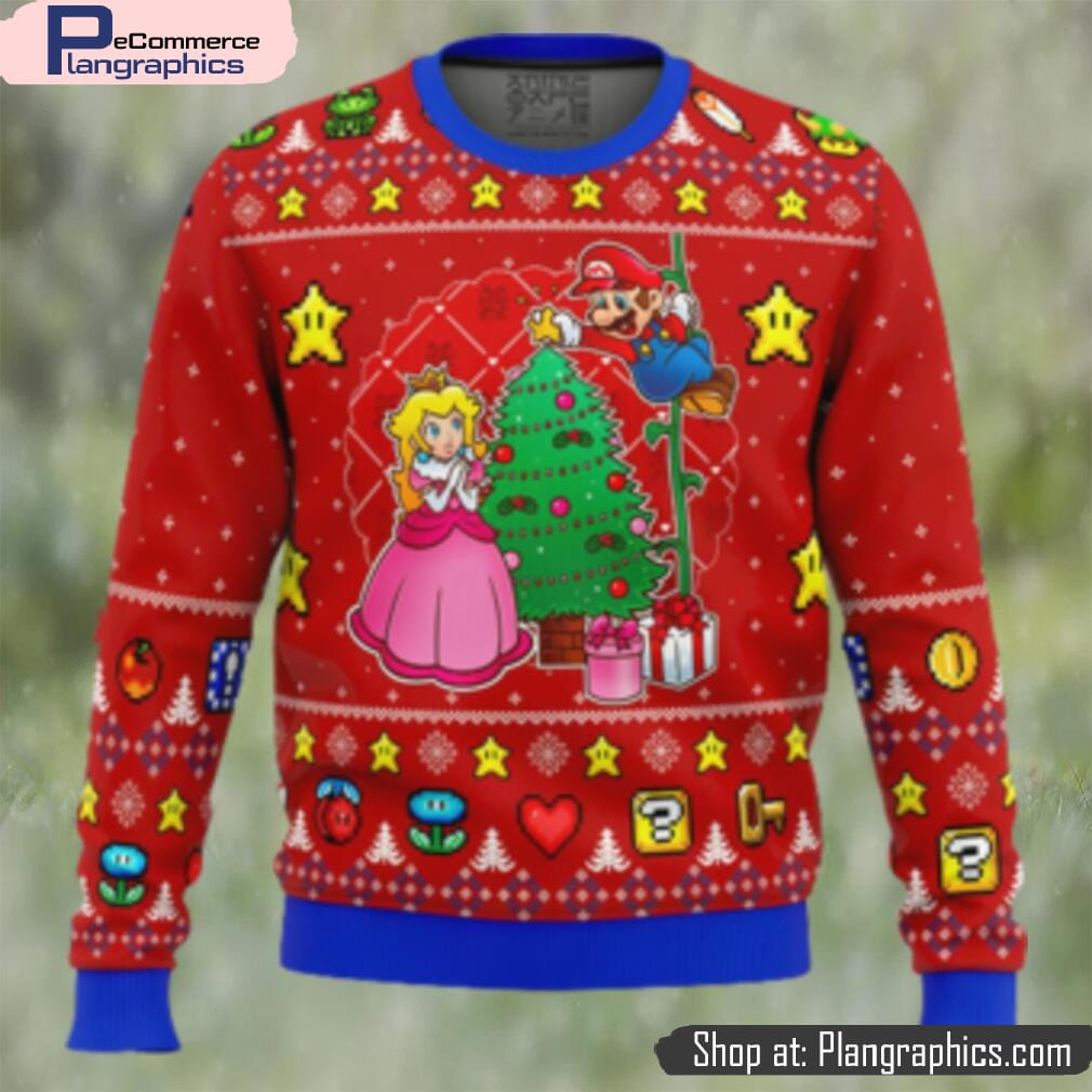 Celebrate the holiday season in style with the Super Mario Ugly Christmas Sweater! This festive sweater features a fun and vibrant design that showcases Super Mario himself coming to see a beautifully-decorated Christmas tree. The sweater is adorned with colorful ornaments, twinkling lights, and a merry atmosphere. It’s the perfect choice for any Super Mario fan looking to spread some holiday cheer. Made with a soft and comfortable fabric, this sweater is not only stylish but also cozy. Whether you’re attending an ugly sweater party or just want to show off your love for Super Mario during the holidays, this Christmas sweater is the ideal choice.