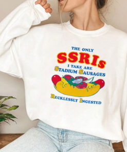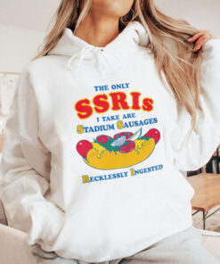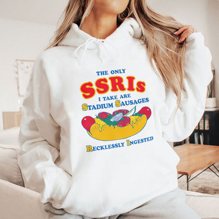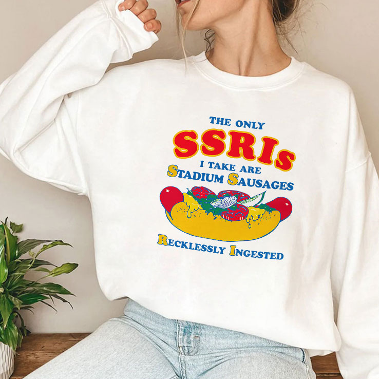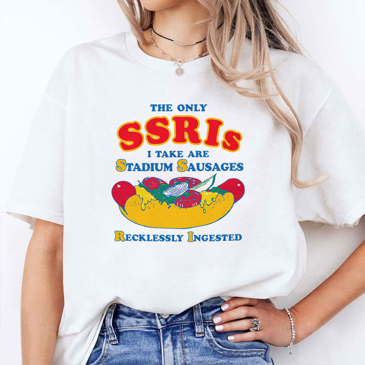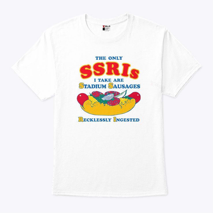 There’s a certain pride in wearing what makes you laugh out loud — a badge of irreverence that says, “I’m not here to conform.” This shirt nails that vibe with a wildly playful spirit that’s impossible to ignore. The design is loud and unapologetic, featuring bright colors that practically jump out at you. At the center, a hilariously oversized hot dog graphic sits right beneath large, cartoonish varsity-style letters that shout the message with perfect comedic timing. The typography strikes just the right balance between bold and cheeky, making the statement clear but never losing that tongue-in-cheek charm. It’s the kind of shirt that sparks conversations, whether you’re hanging out with friends or crashing a casual social event. Throw it on with your favorite jeans and a worn-in pair of sneakers for a look that’s effortlessly cool and full of personality. This shirt isn’t for the faint of heart—it’s for those young adults who thrive on meme culture and enjoy cracking a joke at their own expense. If you’ve ever chuckled over clever wordplay or appreciate humor that’s a bit offbeat, you’ll wear this with pride. It’s also a fantastic gift if you know someone who embraces bold humor and understands that the only SSRIs worth mentioning here are stadium sausages—and plenty of them. A little cheeky, a little brash, and entirely fun, this tee is a quirky wardrobe staple for those who don’t take themselves too seriously.