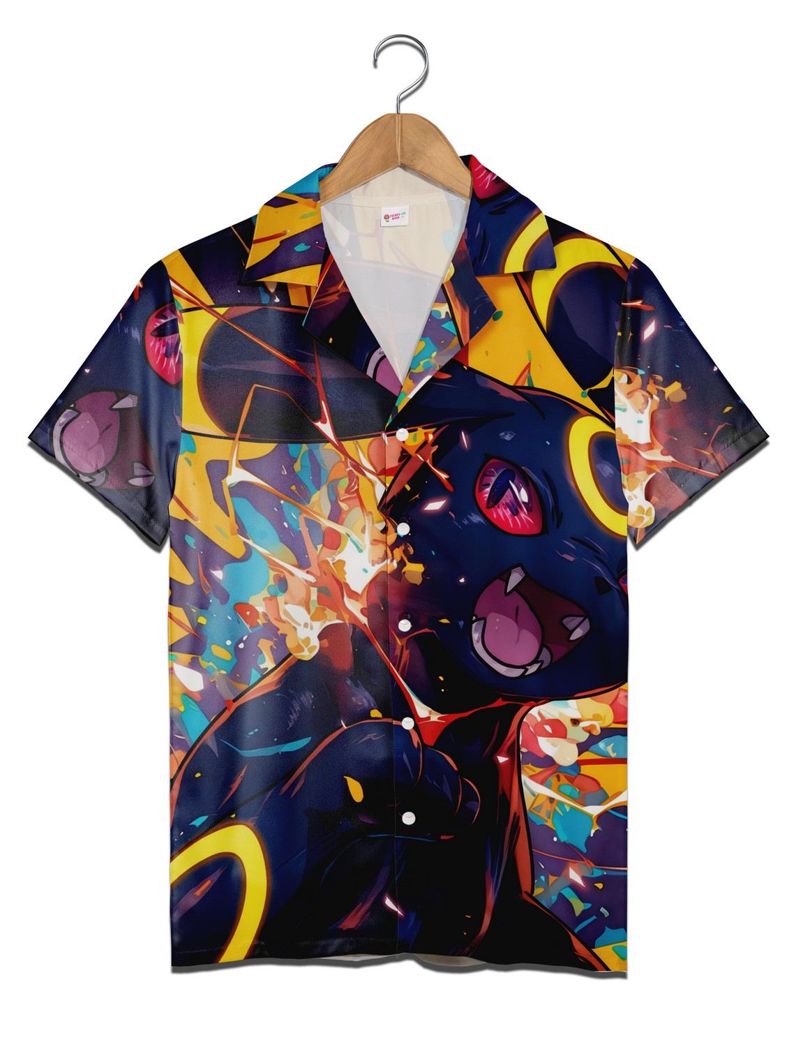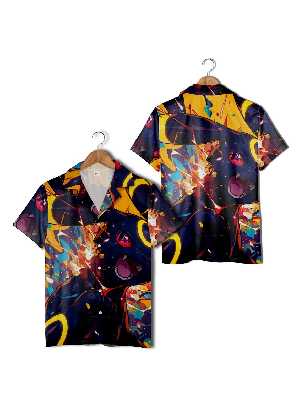 The dark navy canvas of this Umbreon Hawaiian shirt hums with a restless energy, like the night sky punctuated by flickering neon signs. Bright yellow and orange shapes collide in a chaotic dance—circular rings reminiscent of Umbreon’s glowing markings spin amid splashes of color, while sharp-edged anime-style faces peek through in all their expressive intensity. It’s a wild, psychedelic tapestry that doesn’t shy away from standing out, one that celebrates vibrancy and an untamed spirit. Wearing this shirt feels less like choosing an outfit and more like declaring a mood. It’s for anyone who sees their clothing as a snapshot of their personality—playful, bold, maybe even a little defiant against quiet conformity. The Umbreon Hawaiian shirt is suited to those who carry a spark of fandom pride without locking themselves into clichés, people who want to blend nostalgia with something strikingly original. Whether worn at a beach party or during casual weekends spent with friends, it’s the kind of garment that invites conversation and reflects someone who charts their own course. This piece fits comfortably into the wardrobes of Pokemon enthusiasts and anime lovers alike, bridging the gap between fandom and everyday edge. It’s also an unexpected but thoughtful gift for those who cherish eye-catching patterns and colorful self-expression—kids and adults alike who revel in the chance to wear their passions on their sleeves, quite literally.