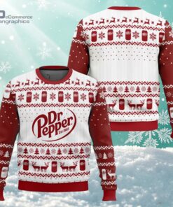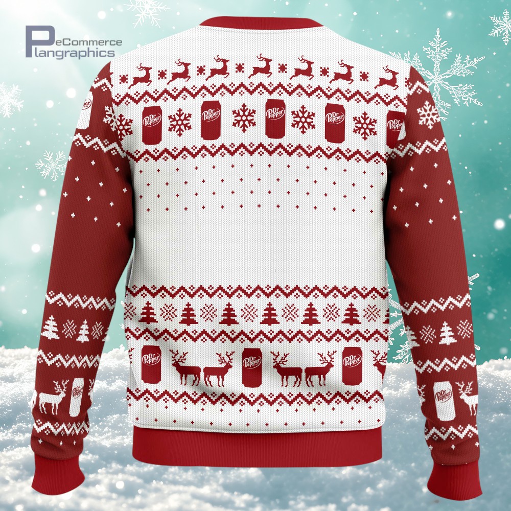 The sharp contrast of red and white stitches creates a lively rhythm across this holiday sweater, catching eyes with its vibrant all-over print. Snowflakes settle alongside miniature trees and prancing reindeer, all woven together with the unmistakable Dr Pepper logo seamlessly blended into the pattern like a secret handshake among fans. The knitted texture adds warmth, both physically and visually, turning heads at family gatherings or casual office parties. Wearing this Dr Pepper ugly Christmas sweater signals more than just festive cheer; it’s a playful nod to a shared passion, a conversation starter for those who appreciate the quirky side of holiday traditions. It fits naturally into the wardrobe of anyone who enjoys layering personality into seasonal outfits without taking things too seriously. Whether sipped from a classic glass bottle or proudly worn during a cookie exchange, it embraces the spirit of casual fun wrapped in nostalgic branding and holiday motifs. This sweater suits anyone who finds joy in mixing bright designs with a touch of humor—especially those who see festive dressing as an opportunity to showcase their fandom with a wink. A fan of Dr Pepper will recognize the care taken to weave iconic elements into a classic ugly Christmas sweater silhouette, making it more than just a piece of clothing, but a lighthearted expression of identity during the winter months.