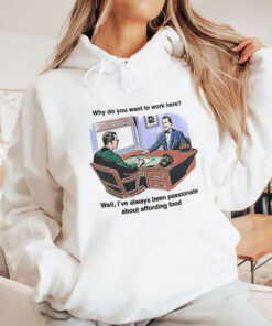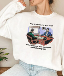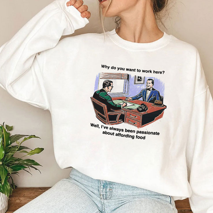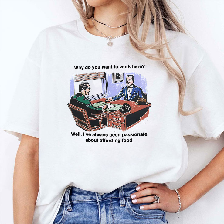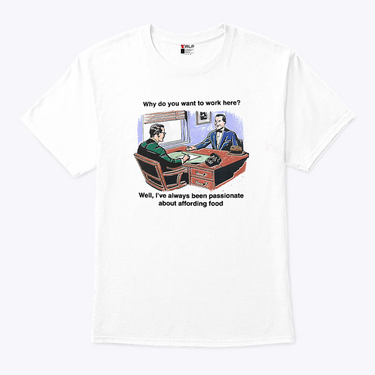Muted office lighting casts soft shadows over a cluttered desk where two men exchange glances, mid-conversation, amid stacks of receipts and a ringing telephone. The illustration captures a moment that’s quietly absurd, complete with bold, informal captions arranged in a playful two-line layout. The cartoon figures, rendered in retro style, evoke a sense of everyday office life seen through a humorous, almost nostalgic lens. This shirt carries the kind of wit that’s perfect for those who appreciate humor grounded in real-world contexts—young professionals, meme enthusiasts, anyone who’s endured the peculiar charm of workplace exchanges. Wearing it signals an easy confidence and a refusal to take the daily grind too seriously, proving that office banter can be a small stage for showing personality. It pairs effortlessly with laid-back jeans or casual chinos, layering well under a soft cardigan or denim jacket. This is the kind of tee that resonates with people who find identity in shared jokes and subtle rebellion against corporate clichés. A reliable conversation starter, it’s a cheeky nod to anyone who’s ever fielded that classic interview question: why do you want to work here? Those drawn to this design don’t just wear it; they inhabit it, owning the moment with a knowing smile. Whether gifting it to a colleague with a sharp sense of humor or slipping it on for a casual day at the office, this tee carries a story of individuality wrapped in lighthearted wit.