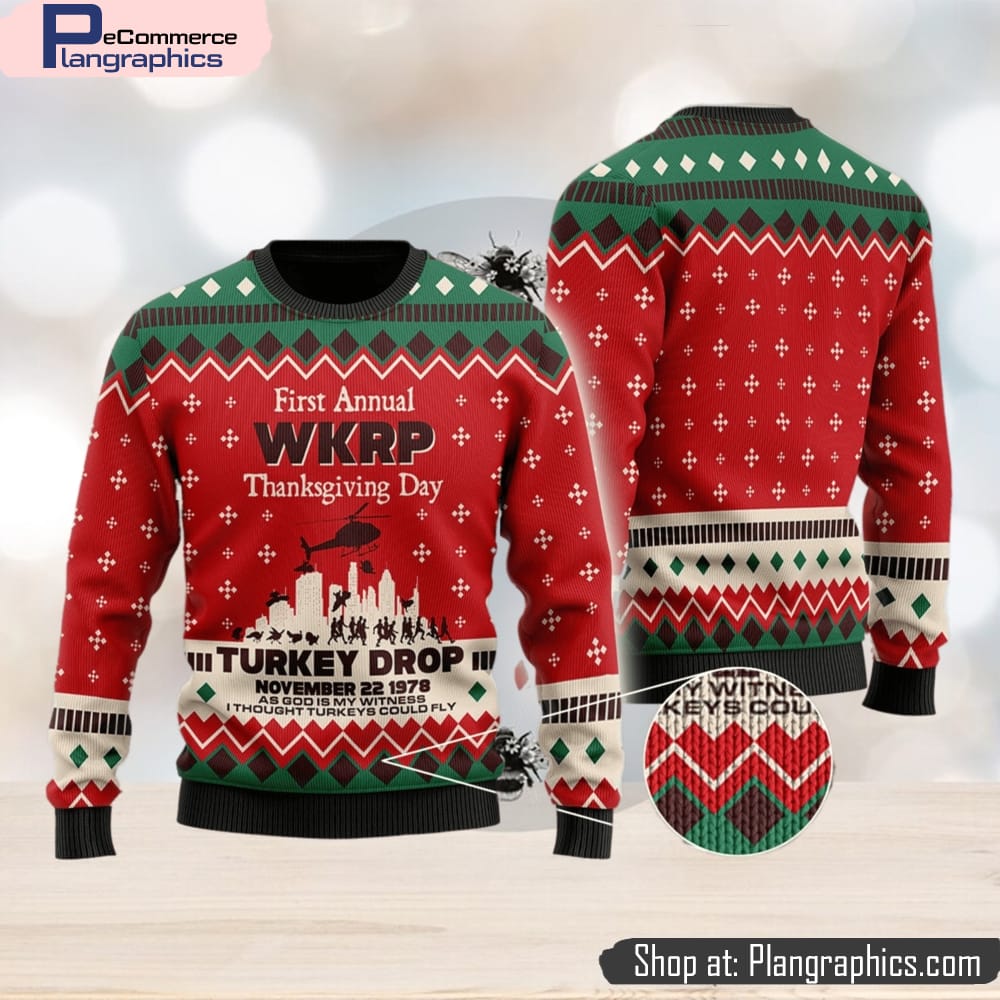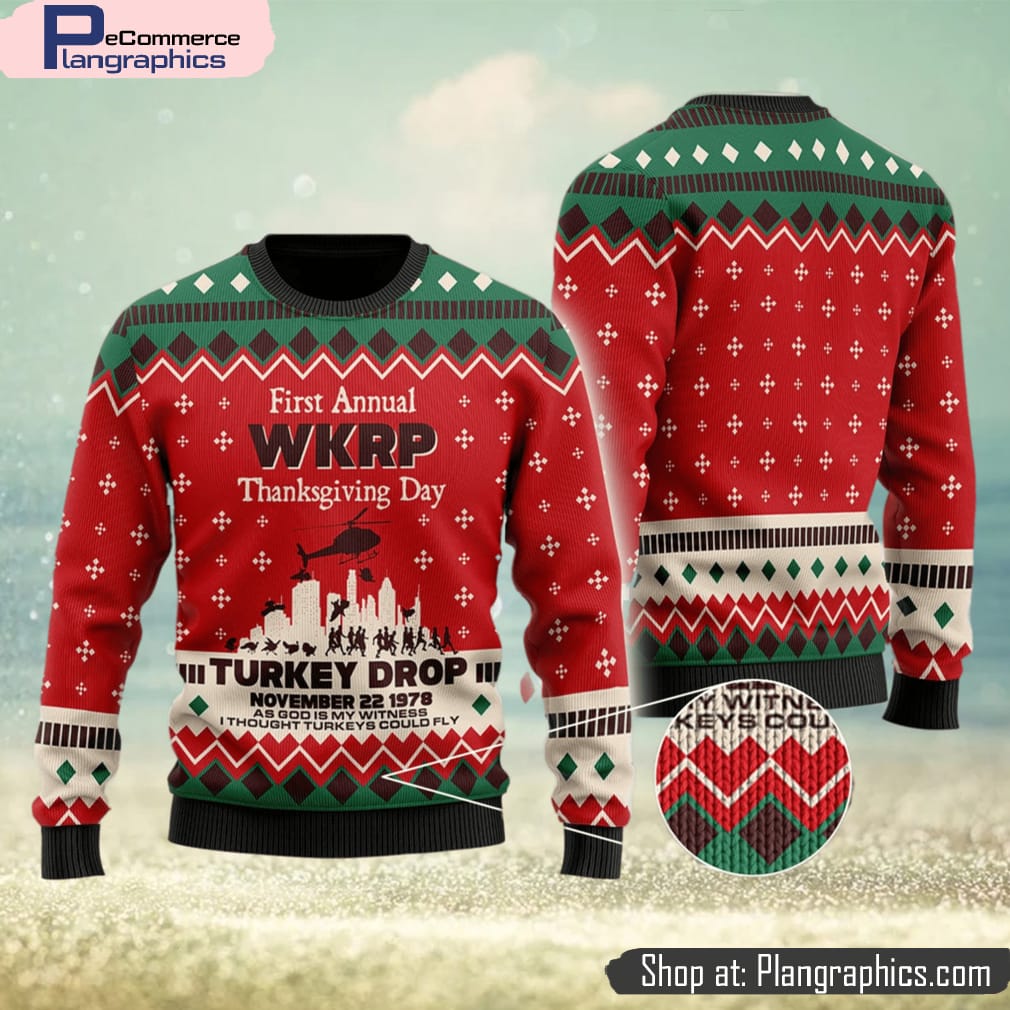 WKRP in Cincinnati First Annual WKRP Thanksgiving Day Turkey Drop Family Gift Ugly Christmas Sweater features