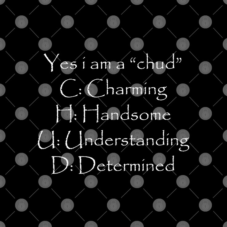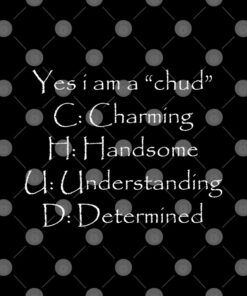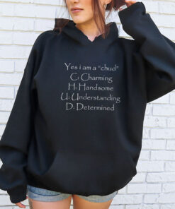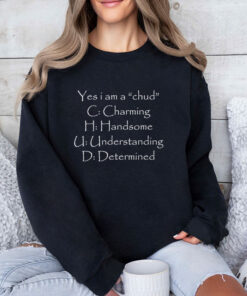 Exude confidence with this witty design highlighting your unique qualities: Charming, Handsome, Understanding, and Determined. Each letter playfully spells out an empowering message, perfect for those who embrace their individuality. Whether you're gifting it or wearing it yourself, this shirt adds a touch of humor and personality to any wardrobe. Celebrate your inner chud with pride and let the world know what you stand for!