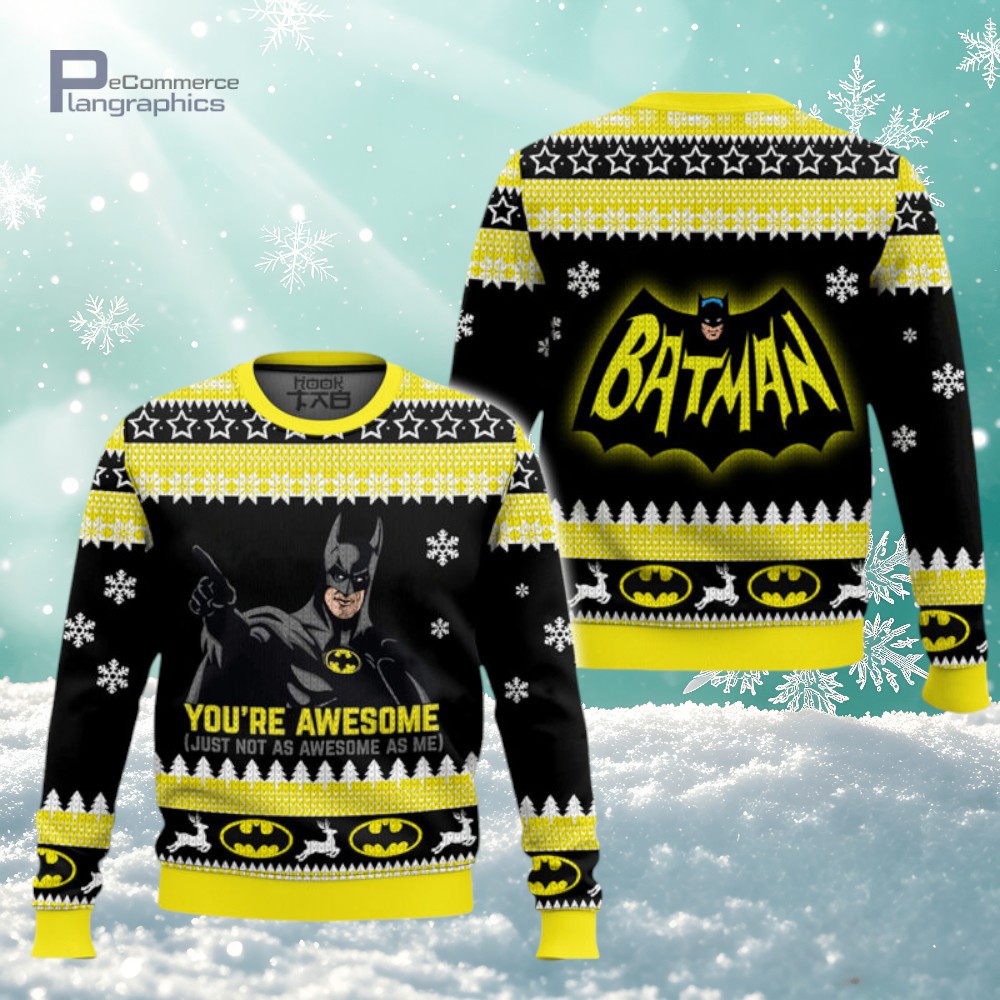 In a world where Gotham’s protector casts a long shadow, this sweater stakes a claim with a bold, playful twist on fandom pride. The rich black-and-yellow palette instantly signals Batman’s emblematic presence, surrounded by snowflakes and star patterns that add a festive edge without losing that nocturnal vibe. Across the front, the sharp, uppercase lettering strikes with cheeky confidence: You're Awesome, Just Not As Awesome As Me, carved in bright yellow to stand out like a bat signal cutting through the night sky. It’s not just an ugly Christmas sweater; it’s a statement for those who appreciate the dark knight’s brooding charisma and enjoy a little self-aware bragging. The graphic balances nostalgia and humor, making it the kind of piece that feels most at home in a casual holiday setting—think: a get-together where pop culture references fly fast, and the best conversations happen between laughs. Someone who knows their way around Gotham’s lore, and isn’t shy about owning their fan credentials, would wear this with confidence. Layer it over a simple tee or pair it with jeans for a look that’s effortlessly bold without trying too hard. This sweater fits perfectly within the seasonal chaos of gift exchanges or holiday parties where a touch of playful swagger is welcomed. Its vibe aligns well with anyone who embraces the quirks of fandom while also loving a good chuckle. In other words, it’s a choice for those who get what it means to be “awesome,” but also know how to call it like it is, even in a sea of festive sweaters.